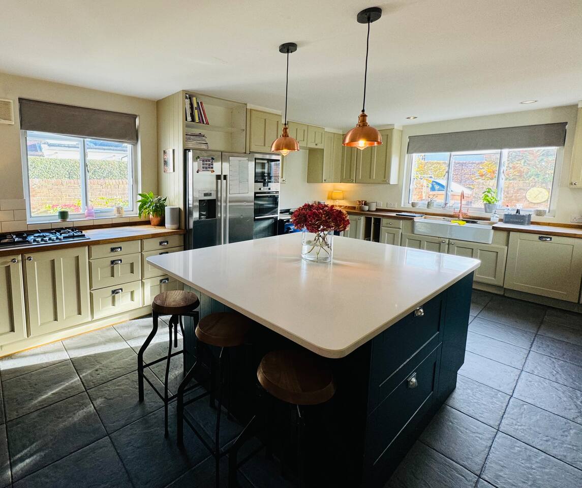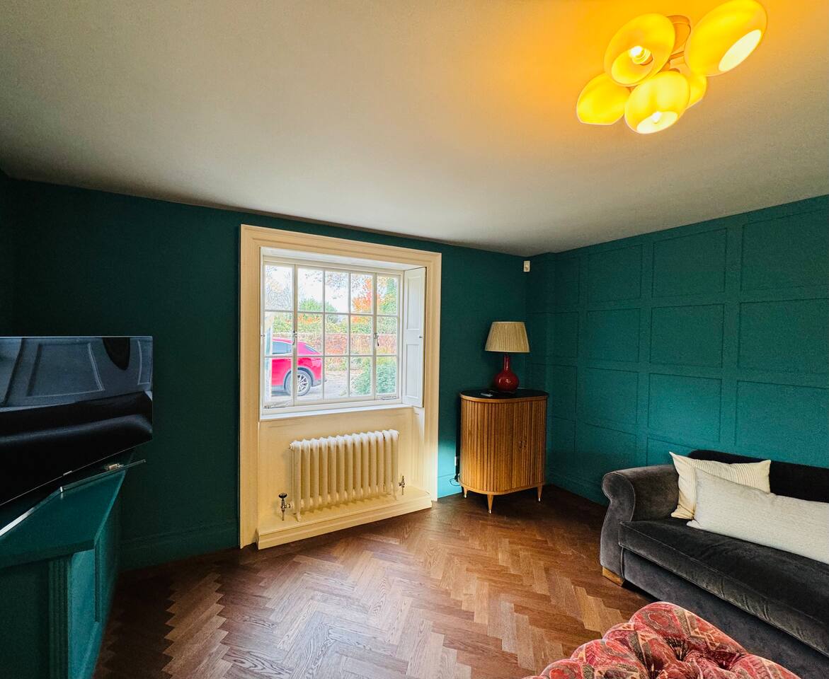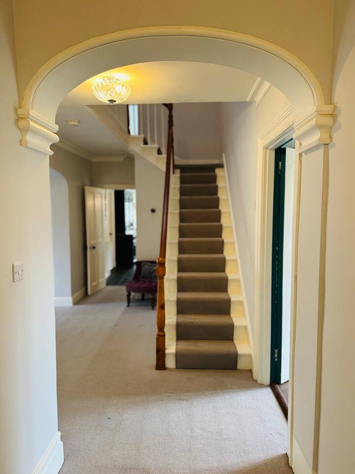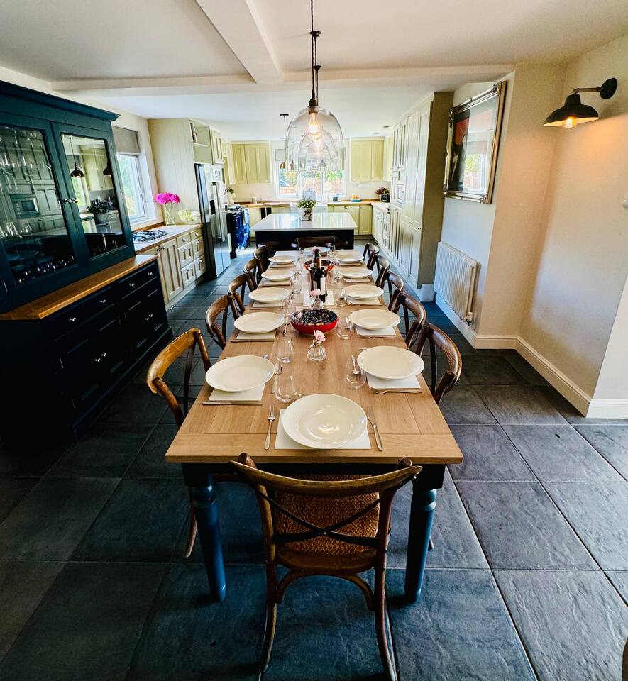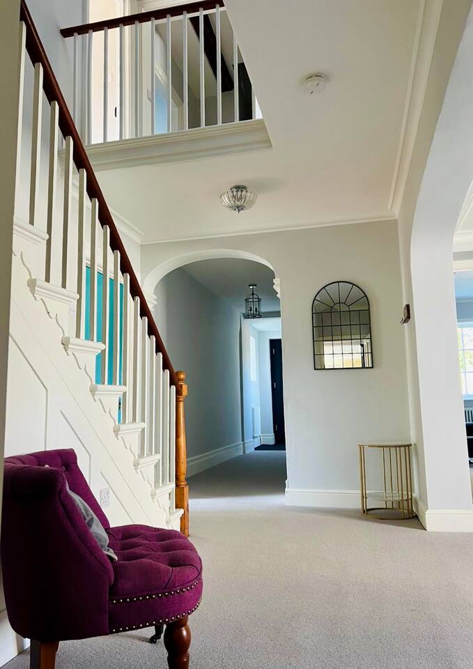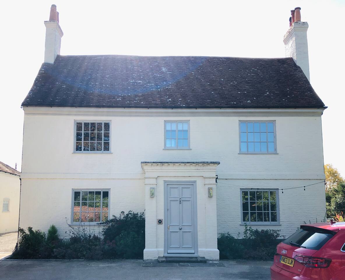 Gorgeous 7 double bedroom Georgian house situated in 2 acres of landscaped grounds on the edge of the idilic South Downs. Conveniently located moments from historic Winchester; with train station, river walks and fabulous pubs - all within walking distance! Perfectly located for exploring all Hampshire has to offer, the New Forest & the South Downs, and the beautiful beaches of Dorset. The house is a beautiful Georgian building tastefully renovated to a high standard, with quality furniture and luxury linens. The house provides spacious luxury accommodation for ups to 14 guests, with 7 large bedrooms - 5 with ensuite, and multiple larges entertaining and family spaces on the ground floor. The house includes: Ground Floor: - Kitchen & dining space for 12, dish washer, American style Siemens fridge freezer, Siemens appliances, nespresso, all usual kitchen equipment, crockery, etc Utility: - Large Samsung washing machine, Bosch dryer Large double lounge: - oak parque flooring, 2 Chesney fireplaces & woodburners, 2 x 3 seater sofas, 4 armchairs, large Samsung HD tv. Snug:- Sofa, armchair, samsung tv Conservatory: - 2 large sofas seating up to 9, with views over the landscaped garden. WC & cloak room. First Floor: Bedroom 1 - Super king sized bed with ensuite bathroom Bedroom 2 - King sized bed with ensuite shower room Bedroom 3 - King sized bed with ensuite bathroom - also family bathroom. Bedroom 4 - King sized bed with ensuite shower room shared Bedroom 5 Bedroom 5 - King sized bed with ensuite shower room shared Bed 4 Third Floor:- Bedroom 6 - Double sized bed Bedroom 7 - Double sized bed Outside: - Gorgeous landscaped outside dining area with seating for 12, a large outside sofa, sun loungers, large chimnea, fire pit, gas bbq. All leading onto 1.5 acres of lawned garden surround by mature trees, pleached espalier trees, and Magnolia. The electric gated car access leads to private off street parking in front of the house for several cars. Please note, this gate is shared with the adjacent cottage. Winchester city centre can be reached with a 10 minute drive. Winchester is a perfect sized cathedral city, with history, boutique shops, and some amazing restaurants & bars. For foodies the restaurants include: The Ivy, Rick Steins, The Chisel Rectory, and the incredible Kyoto Kitchen. The New Forest is a 20 minute drive, and the beach can be reached in 25 minutes. Bournemouth is around 35 minutes. Twyford is a few minutes drive from the M3 (Junc. 11). Shawford train station is a few minutes walk from the house no