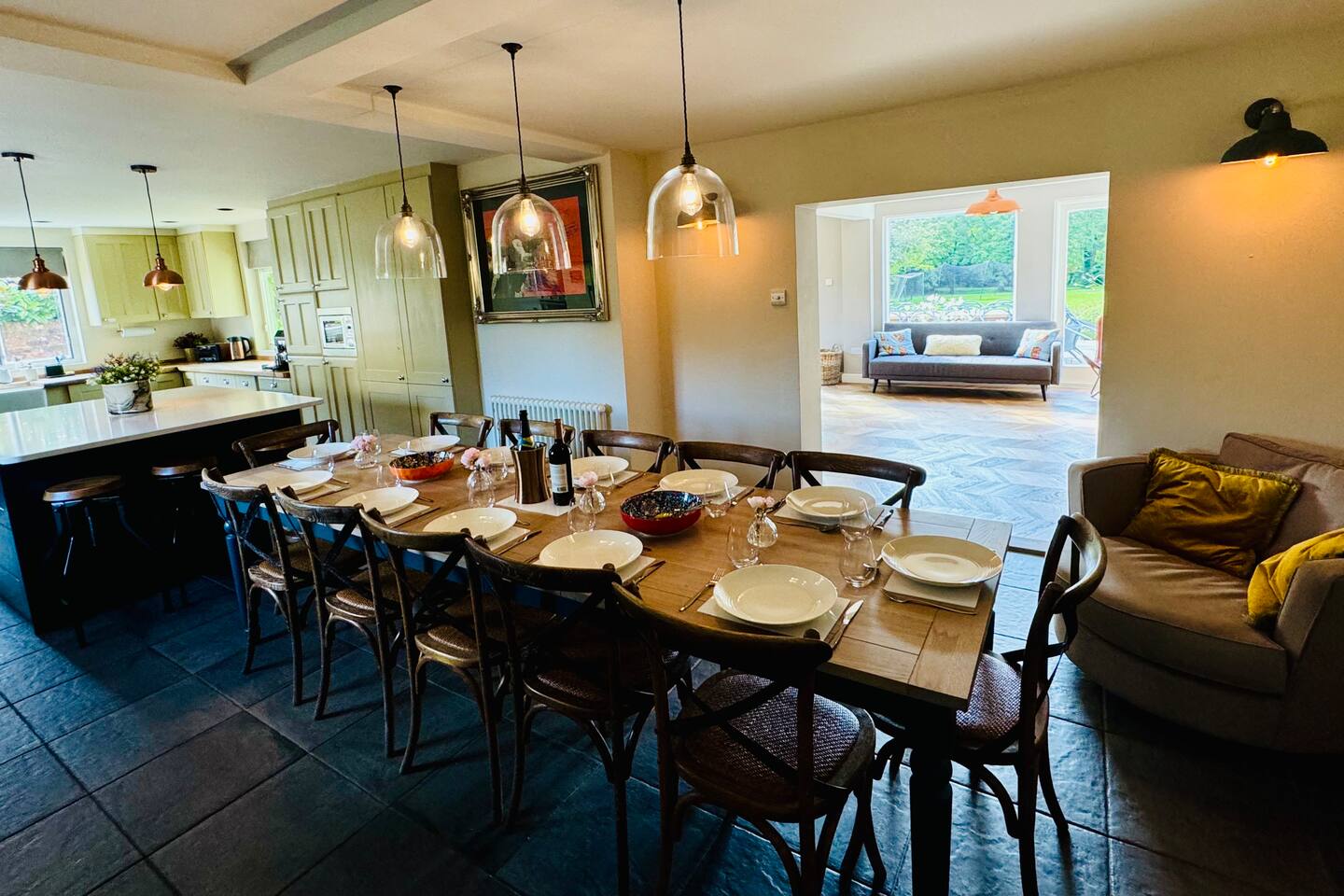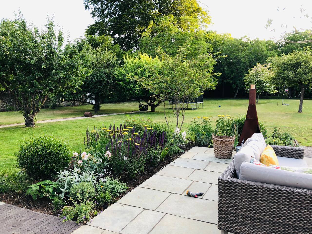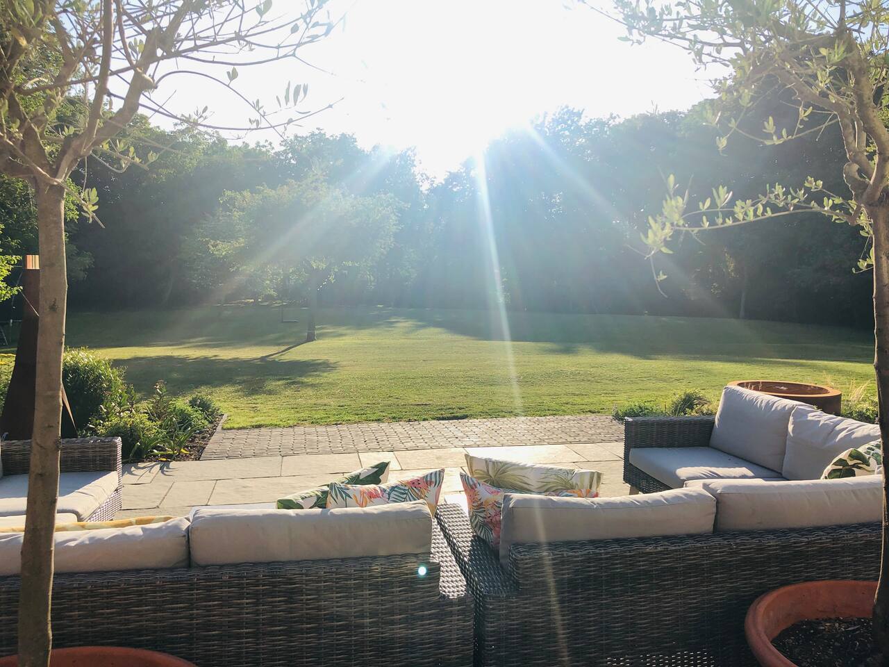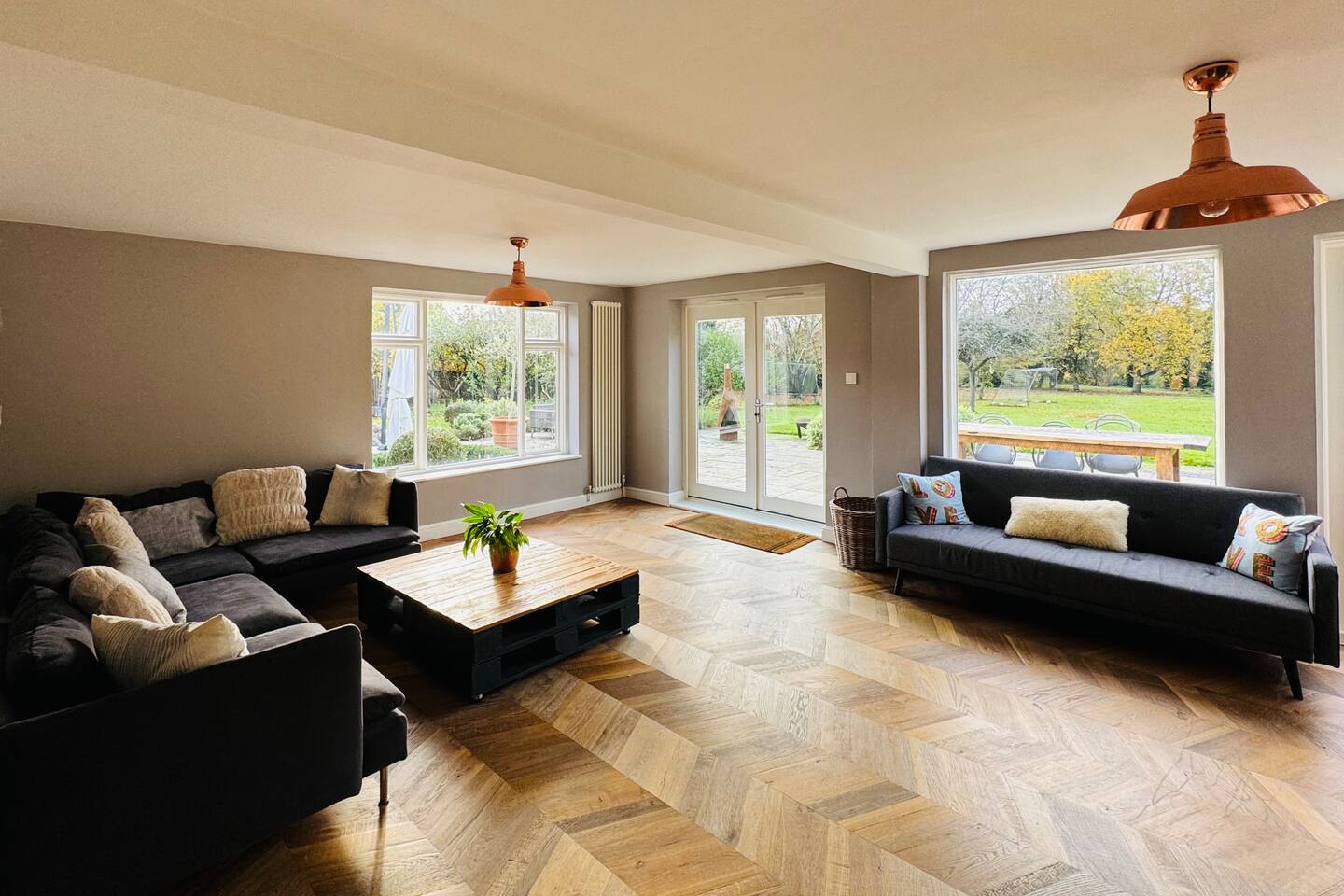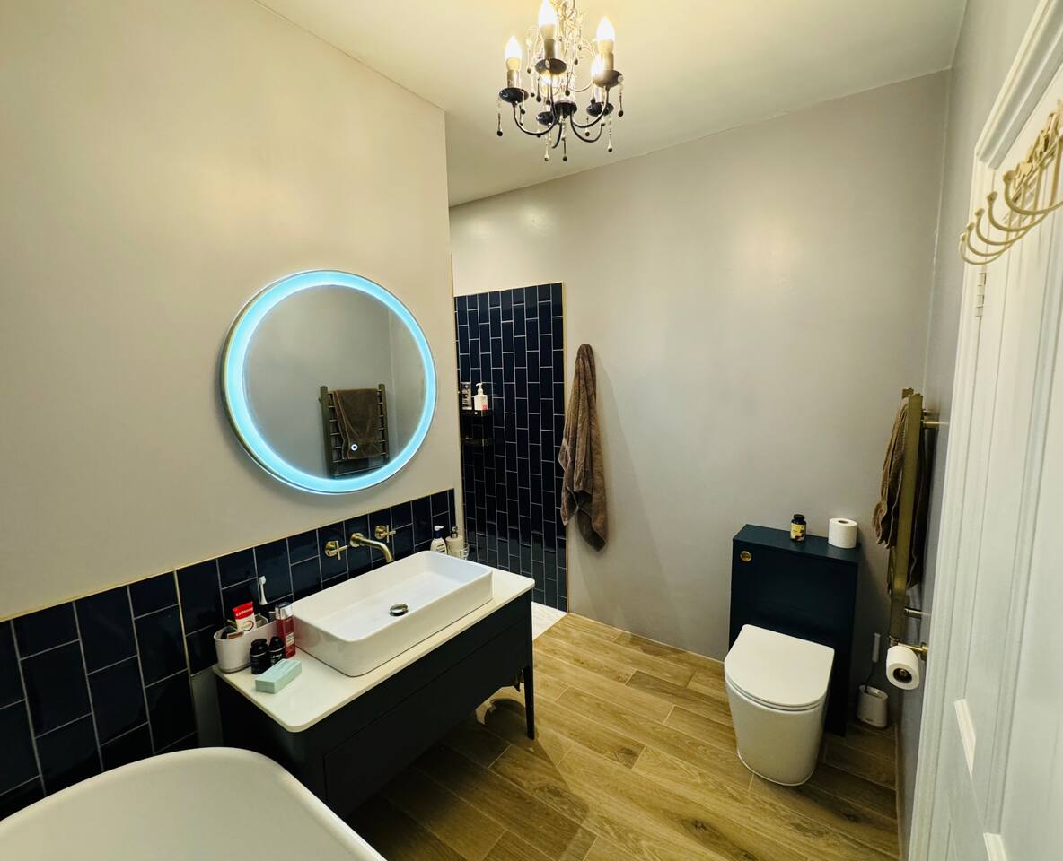 Gorgeous 7 double bedroom Georgian house situated in 2 acres of landscaped grounds on the edge of the idilic South Downs. Conveniently located moments from historic Winchester; with train station, river walks and fabulous pubs - all within walking distance! Perfectly located for exploring all Hampshire has to offer, the New Forest & the South Downs, and the beautiful beaches of Dorset. The house is a beautiful Georgian building tastefully renovated to a high standard, with quality furniture and luxury linens. The house provides spacious luxury accommodation for ups to 14 guests, with 7 large bedrooms - 5 with ensuite, and multiple larges entertaining and family spaces on the ground floor. The house includes: Ground Floor: - Kitchen & dining space for 12, dish washer, American style Siemens fridge freezer, Siemens appliances, nespresso, all usual kitchen equipment, crockery, etc Utility: - Large Samsung washing machine, Bosch dryer Large double lounge: - oak parque flooring, 2 Chesney fireplaces & woodburners, 2 x 3 seater sofas, 4 armchairs, large Samsung HD tv. Snug:- Sofa, armchair, samsung tv Conservatory: - 2 large sofas seating up to 9, with views over the landscaped garden. WC & cloak room. First Floor: Bedroom 1 - Super king sized bed with ensuite bathroom Bedroom 2 - King sized bed with ensuite shower room Bedroom 3 - King sized bed with ensuite bathroom - also family bathroom. Bedroom 4 - King sized bed with ensuite shower room shared Bedroom 5 Bedroom 5 - King sized bed with ensuite shower room shared Bed 4 Third Floor:- Bedroom 6 - Double sized bed Bedroom 7 - Double sized bed Outside: - Gorgeous landscaped outside dining area with seating for 12, a large outside sofa, sun loungers, large chimnea, fire pit, gas bbq. All leading onto 1.5 acres of lawned garden surround by mature trees, pleached espalier trees, and Magnolia. The electric gated car access leads to private off street parking in front of the house for several cars. Please note, this gate is shared with the adjacent cottage. Winchester city centre can be reached with a 10 minute drive. Winchester is a perfect sized cathedral city, with history, boutique shops, and some amazing restaurants & bars. For foodies the restaurants include: The Ivy, Rick Steins, The Chisel Rectory, and the incredible Kyoto Kitchen. The New Forest is a 20 minute drive, and the beach can be reached in 25 minutes. Bournemouth is around 35 minutes. Twyford is a few minutes drive from the M3 (Junc. 11). Shawford train station is a few minutes walk from the house no