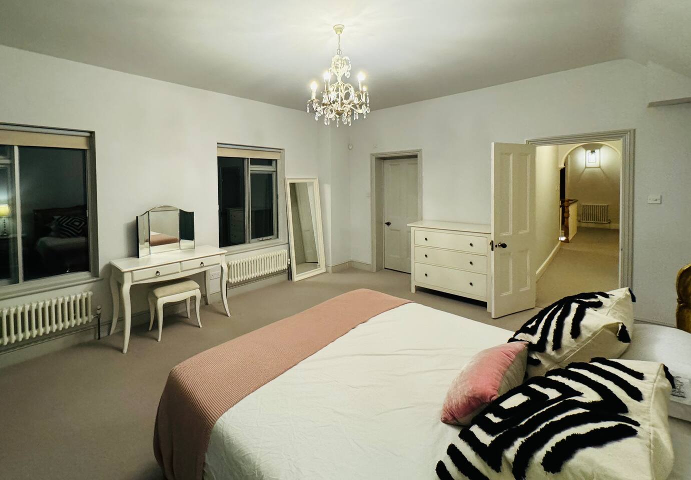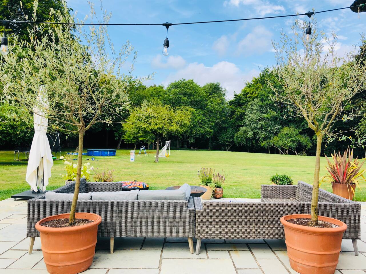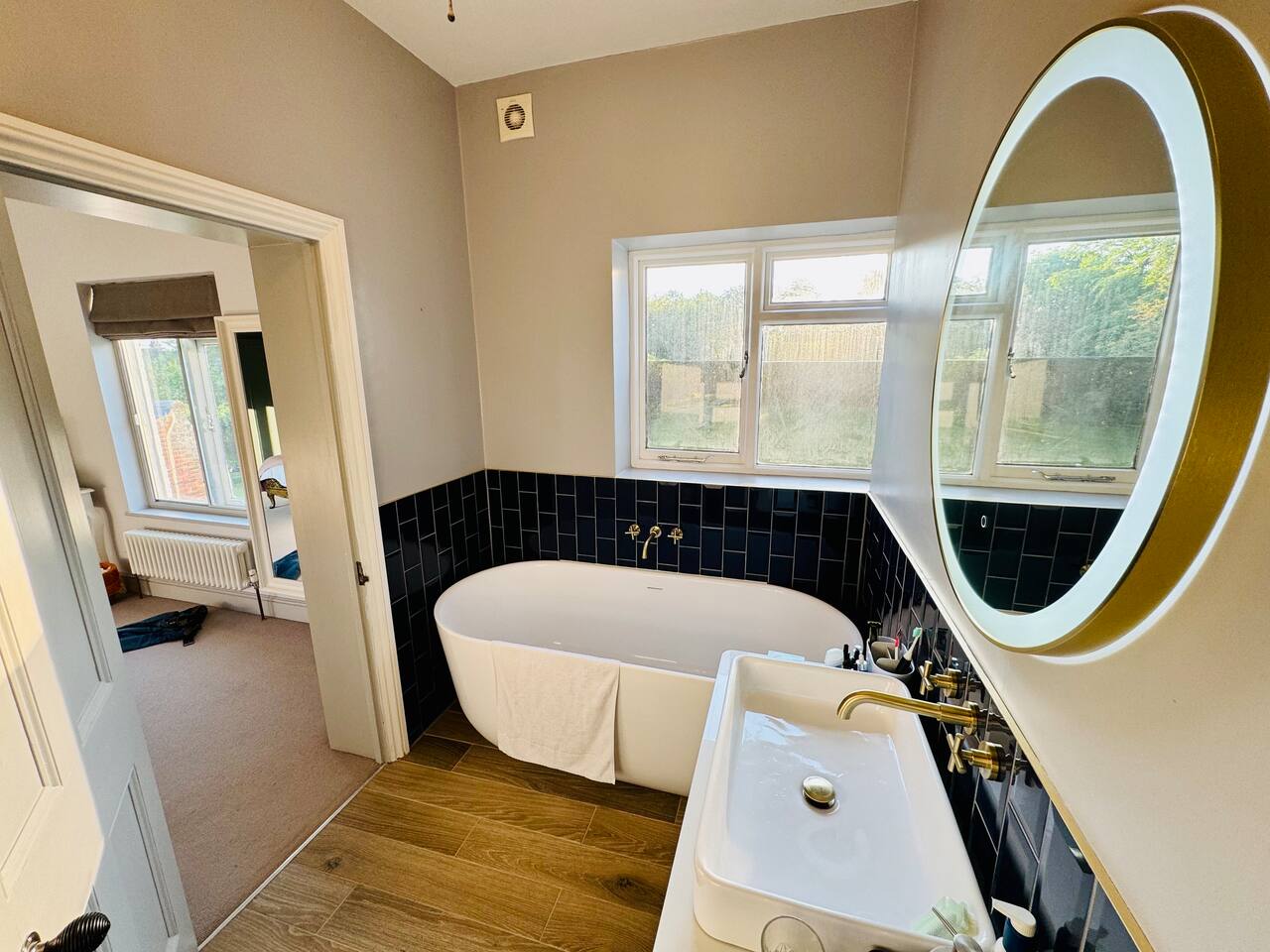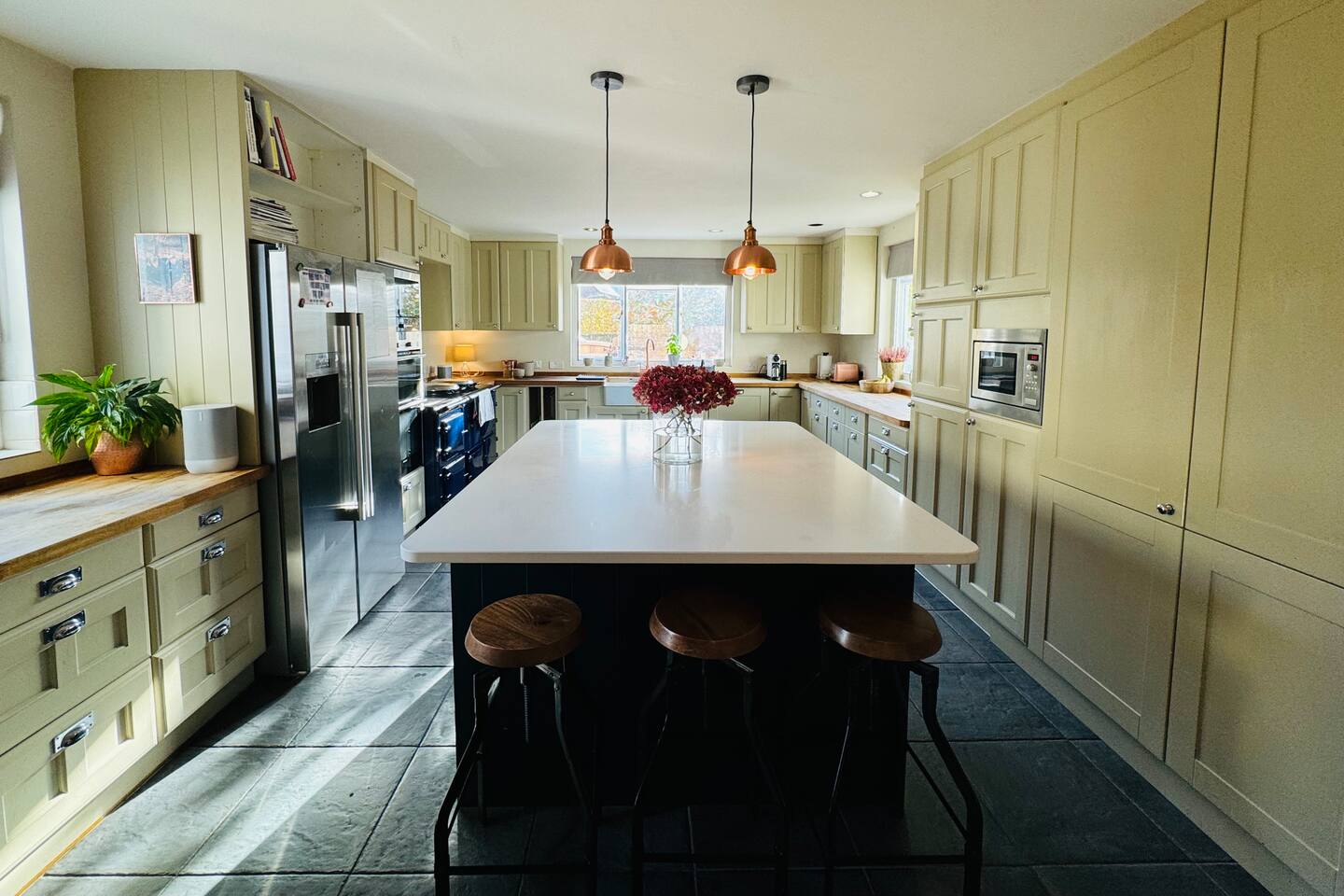 Gorgeous 7 double bedroom Georgian house situated in 2 acres of landscaped grounds on the edge of the idilic South Downs. Conveniently located moments from historic Winchester; with train station, river walks and fabulous pubs - all within walking distance! Perfectly located for exploring all Hampshire has to offer, the New Forest & the South Downs, and the beautiful beaches of Dorset. The house is a beautiful Georgian building tastefully renovated to a high standard, with quality furniture and luxury linens. The house provides spacious luxury accommodation for ups to 14 guests, with 7 large bedrooms - 5 with ensuite, and multiple larges entertaining and family spaces on the ground floor. The house includes: Ground Floor: - Kitchen & dining space for 12, dish washer, American style Siemens fridge freezer, Siemens appliances, nespresso, all usual kitchen equipment, crockery, etc Utility: - Large Samsung washing machine, Bosch dryer Large double lounge: - oak parque flooring, 2 Chesney fireplaces & woodburners, 2 x 3 seater sofas, 4 armchairs, large Samsung HD tv. Snug:- Sofa, armchair, samsung tv Conservatory: - 2 large sofas seating up to 9, with views over the landscaped garden. WC & cloak room. First Floor: Bedroom 1 - Super king sized bed with ensuite bathroom Bedroom 2 - King sized bed with ensuite shower room Bedroom 3 - King sized bed with ensuite bathroom - also family bathroom. Bedroom 4 - King sized bed with ensuite shower room shared Bedroom 5 Bedroom 5 - King sized bed with ensuite shower room shared Bed 4 Third Floor:- Bedroom 6 - Double sized bed Bedroom 7 - Double sized bed Outside: - Gorgeous landscaped outside dining area with seating for 12, a large outside sofa, sun loungers, large chimnea, fire pit, gas bbq. All leading onto 1.5 acres of lawned garden surround by mature trees, pleached espalier trees, and Magnolia. The electric gated car access leads to private off street parking in front of the house for several cars. Please note, this gate is shared with the adjacent cottage. Winchester city centre can be reached with a 10 minute drive. Winchester is a perfect sized cathedral city, with history, boutique shops, and some amazing restaurants & bars. For foodies the restaurants include: The Ivy, Rick Steins, The Chisel Rectory, and the incredible Kyoto Kitchen. The New Forest is a 20 minute drive, and the beach can be reached in 25 minutes. Bournemouth is around 35 minutes. Twyford is a few minutes drive from the M3 (Junc. 11). Shawford train station is a few minutes walk from the house no